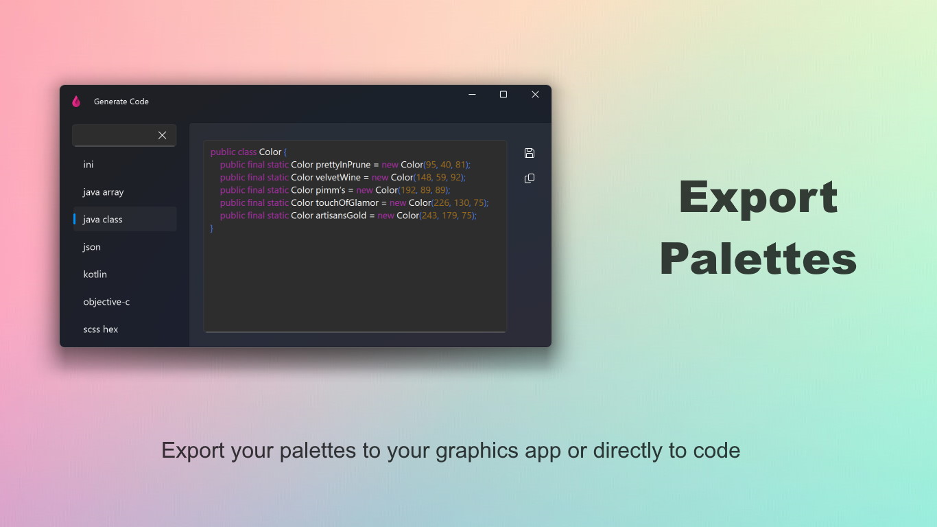 Our tool is designed to help you export your color palettes and generate code snippets in various programming languages. Whether you’re a designer, developer, or just a color enthusiast, PickMe is the perfect tool for you.